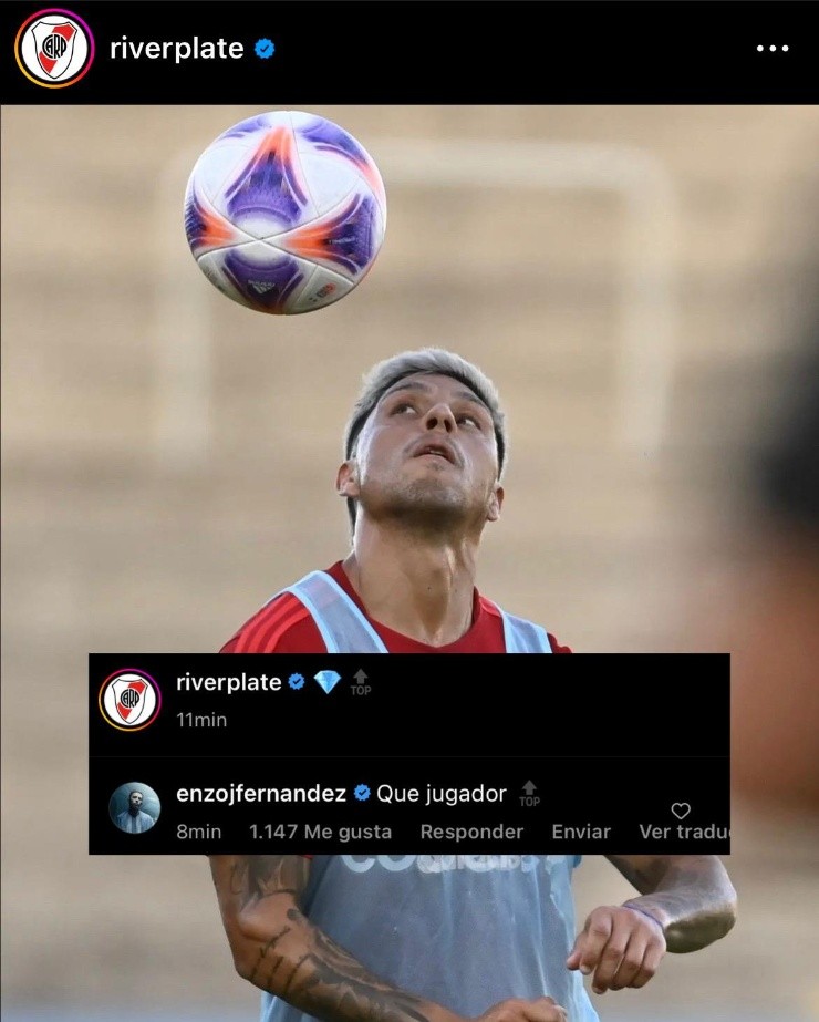 “Que jugador ��” fue el comentario del volante del Benfica, en referencia al posteo de River sobre Enzo Pérez, que aparece haciendo jueguitos con la cabeza. Esta, no es la primera interacción entre ambos, ya que cuando estaban en River, Pérez llamaba en sus historias “Enzo JR” a Fernández.