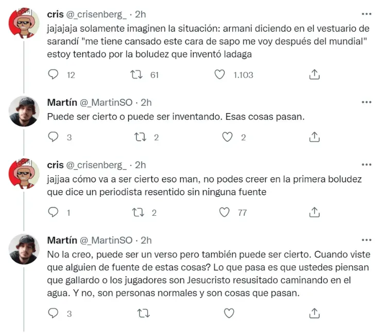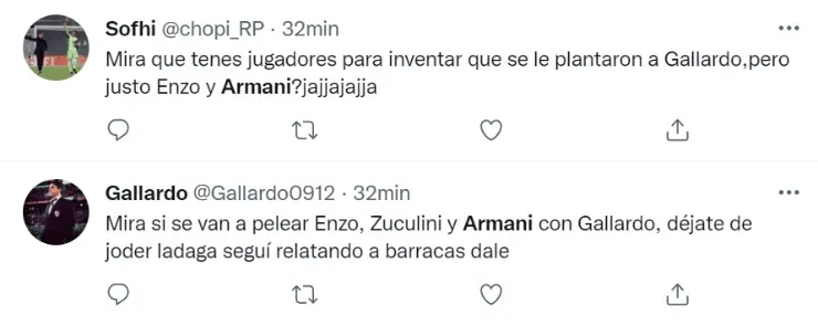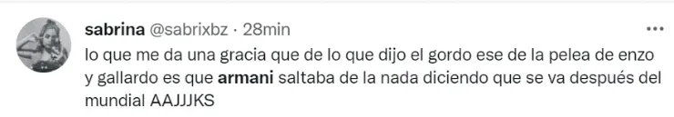 “Van al vestuario y el técnico de River se dirige a Beltrán, y le recrimina ciertas cuestiones que tenían que ver con lo futbolístico. Aparentemente, el modo, el tono, la forma no fue la mejor. El que interviene, y acá está la cuestión, es el mendocino Enzo Pérez. Se levanta, lo mira al entrenador, a Marcelo Gallardo y le dice: ‘Perdón, esto no. La falta de respeto, no. El respeto ante todo. Cuidado’. Se le acerca Armani al jugador, a Enzo Pérez y le dice: ‘Yo tampoco lo aguanto más, después del Mundial me voy. Para mí es ciclo terminado'”, explicó Ladaga en su relato, mientras el periodista Gustavo Sylvestre, conductor del programa Mañana Sylvestre, se mostraba sorprendido ante lo que escuchaba.