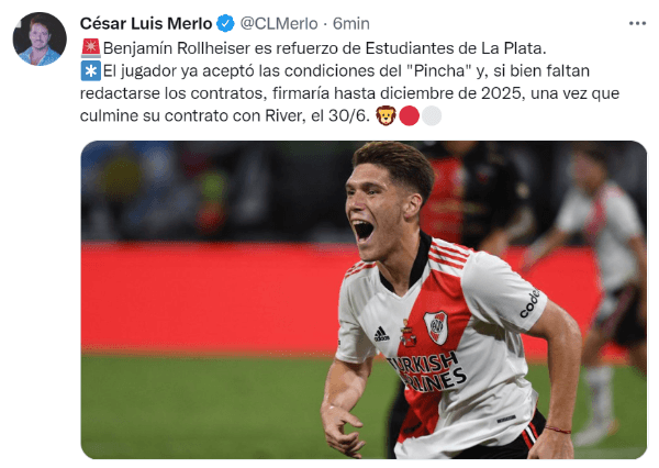 Según la información que compartió el periodista de TyC Sports, César Luis Merlo, Rollheiser continuará con su carrera en Estudiantes de La Plata y disputará la Copa Libertadores con Ricardo Zielinski como principal estandarte del Pincha.