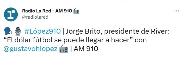 Horas más tarde, Brito charló en La Red y la cuestión económica fue el eje de la conversación, donde salió a la luz uno de los proyectos más ambiciosos que se están gestando dentro de la AFA: un nuevo dólar para el fútbol argentino.“Se le está planteando al Gobierno que haya un ‘dólar fútbol’ y se puede hacer.Elfútbol argentino se lo merece”,fue la frase que abrió el juego.