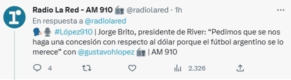 “Son 24.748.000 dólares limpios lo que le corresponde a River, al dólar oficial, no blue. Una parte al contado y otra en cinco cuotas anuales. No es malo el negocio ya que aspiramos a que los dólares oficiales a posteriori tengan una brecha menor”, explicó el presidente del Millonario en Radio Continental.