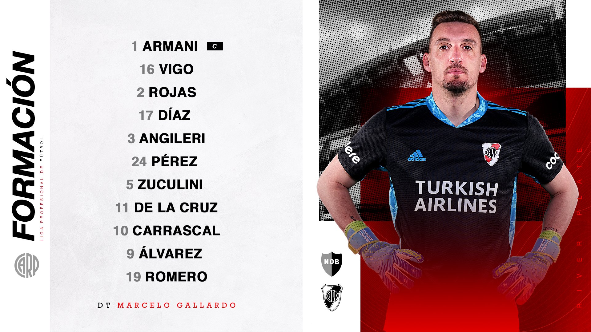 Así, el once de River para enfrentar a Newell’s a partir de las 21 será:Franco Armani; Alex Vigo, Paulo Díaz, Robert Rojas, Fabrizio Angileri;Enzo Pérez, Bruno Zuculini; Jorge Carrascal, Nicolás De La Cruz; Julián Álvarez y Braian Romero.