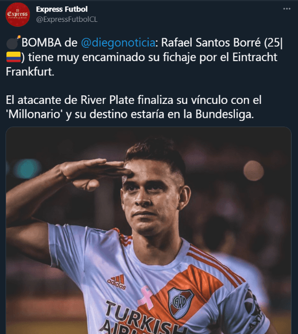 Según informaron este lunes los medios de comunicación colombianos, el conjunto que disputará la próxima edición de la UEFA Europa League tiene avanzadas las negociaciones con Borré, que acumula nada más ni nada menos que 56 anotaciones y 20 asistencias en 149 compromisos oficiales con los dirigidos por el Muñeco Gallardo.