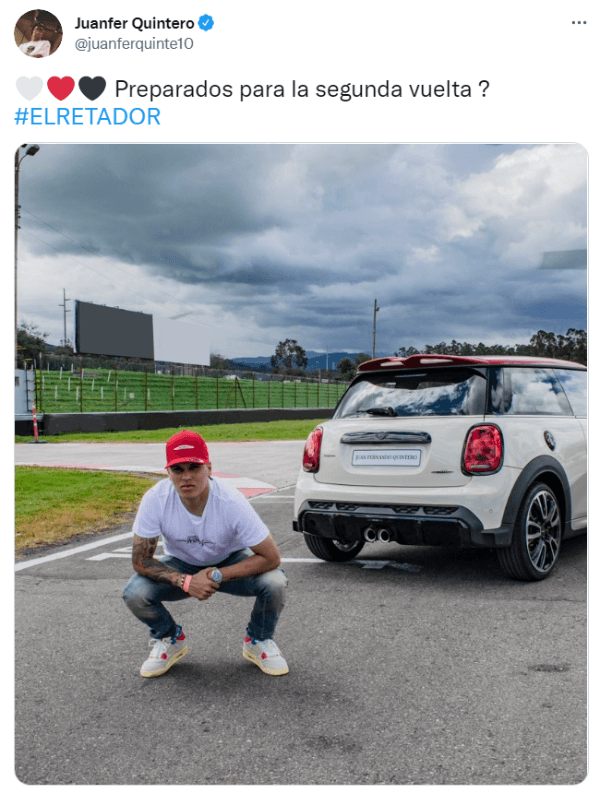 Como si fuera poco, el colombiano volvió a explotar las redes sociales con una publicación a la que le sobran las palabras. “¿Preparados para la segunda vuelta?”, escribió el jugador cafetero en su cuenta oficial de Twitter junto a más corazones de color rojo, blanco y negro; casualmente, su ropa también utilizó los mismos colores.