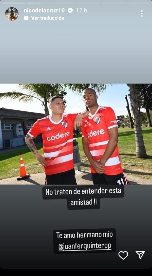 Quintero por su parte, subió la historia en su cuenta de Instagram, devolviendo la pared:“Te amo, ya tu sabes lo que pienso”, cerrando un cruce que emocionó a más de un hincha de River por la salida de uno de los mejores jugadores del ciclo Gallardo.