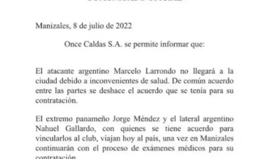 “Once Caldas S.A. se permite informar que el atacante argentino Marcelo Larrondo no llegará a la ciudad debido a inconvenientes de salud. De común acuerdo entre las partes se deshace el acuerdo que se tenía para su contratación”, publicó el Albo mediante un comunicado oficial para dar a conocer la caída de la operación.