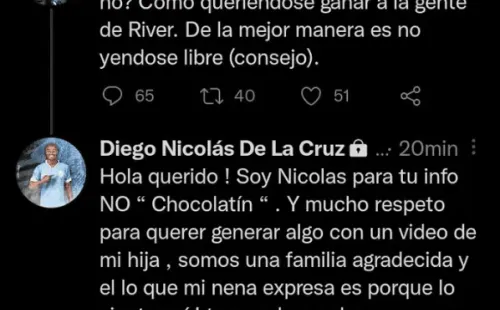 Mientras el posteo se llenaba de comentarios repudiando el tuit, allí apareció Nicolás De La Cruz para responder de forma contundente. “Hola querido! Soy Nicolás para tu info… NO ‘chocolatín”, corrigió el jugador de River que luego fue con los tapones de punta por la acusación del periodista sobre el video publicado.