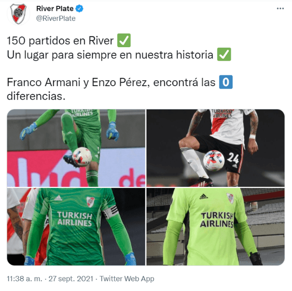 “150 partidos en River Un lugar para siempre en nuestra historia.Franco Armani y Enzo Pérez, encontrá las 0 diferencias”, escribió la cuenta oficial de la institución de Núñez con cuatro fotos comparando a ambos futbolistas. Muy bien.