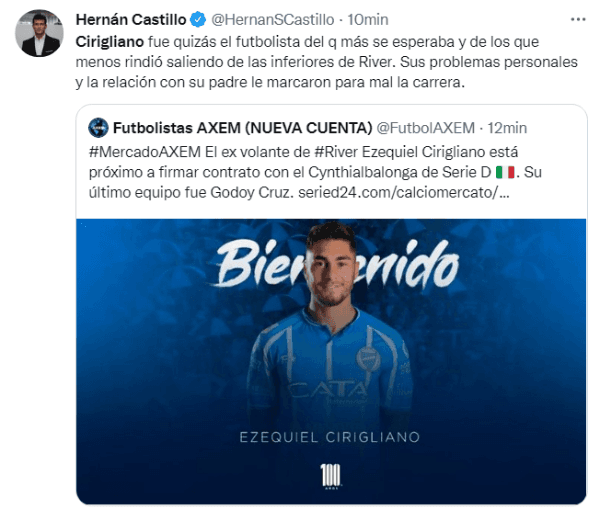A partir de allí, el declive fue instantáneo. “Ciri” pasó por el Dallas FC de la MLS, pero no tuvo suerte y regresó a su país natal para defender los colores de Atlético Tucumán y Tigre. Luego, su destino se encontró en la segunda división del fútbol de Chile y recientemente se conoció su nuevo club, totalmente alejado de la élite. La vieja promesa de River firmó con el exóticoCynthialbalonga, pertenenciente a la cuarta división de Italia, y generó la sorpresa de aquellos que tenían un gran recuerdo de él en Núñez. ¿Podrá enderezar su carrera antes de que llegue a su fin?