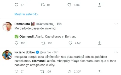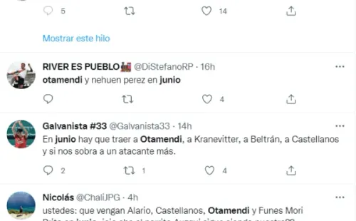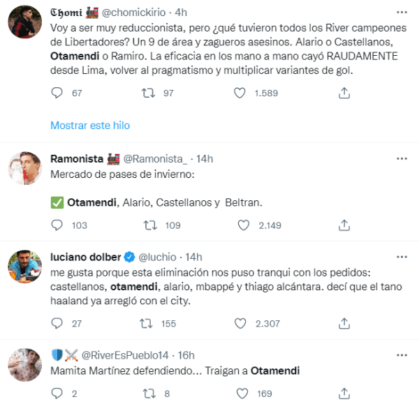 El enojo que produjo la caída de River en algunos fanáticos hizo que el mercado de pases se volviera una obsesión pensando en el armado del plantel que se viene. Es por eso que apellidos como el de Lucas Alario o Valentín Castellanos ocuparon las primeras tendencias de Twitter. No obstante, los errores defensivos hicieron que en Núñez clamaran por una figura de experiencia y con gran presente en la Selección Argentina: Nicolás Otamendi.