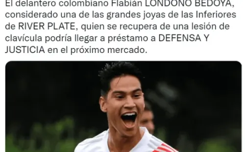 En el marco de la planificación de las salidas, el medio partidarioPlaneta Defensaadvirtió que el juvenil Flabian Londoño Bedoya está en la órbita del equipo que dirige Sebastián Beccacece para este mercado. El colombiano se fracturó la clavícula en un partido de Reserva y aún se encuentra en recuperación, por lo que no descartan un préstamo para que sume minutos en Primera cuando aún no ha debutado en el plantel profesional de River.