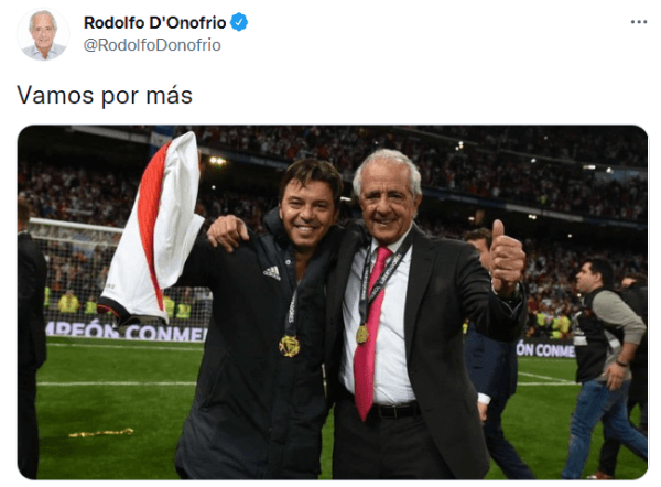 Luego de un día lleno de emociones, previo a la fiesta del 9 de diciembre que se hará en el Estadio Monumental, D’Onofrio volvió a aparecer en redes sociales para compartir su alegría con los hinchas tras semejante anuncio que tuvo lugar en horas del mediodía en el River Camp. Utilizando una foto con el Muñeco en el Santiago Bernabéu de Madrid, el exmandatario dejó un breve pero contundente mensaje de cara al futuro: “Vamos por más”.