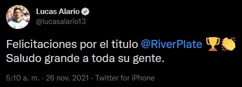 Además, otros dos exjugador de River se sumaron a los saludos. Lucas Alario escribió: “Felicitaciones por el titulo, River Plate. Saludo grande a toda su gente”. Y Juan Fernando Quintero publicó: “Felicidades amigos, CAMPEONES”.
