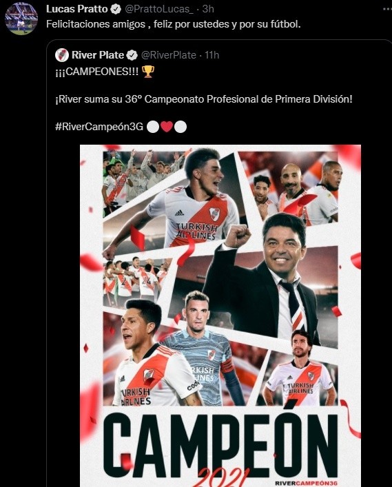 “Felicitaciones, amigos. Feliz por ustedes y por su fútbol”, señaló Pratto, ganador de cuatro títulos con la banda roja, entre ellos la Copa Libertadores 2018.