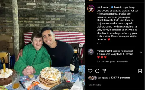 Pablo Solari está atravesando un difícil momento personal debido al fallecimiento de su abuela Elva. Se trata de una persona más que importante en la vida del futbolista, a quien le dedicaba todos y cada uno de sus goles. El pasado martes le comunicaron la noticia y le dedicó una carta en sus redes.
