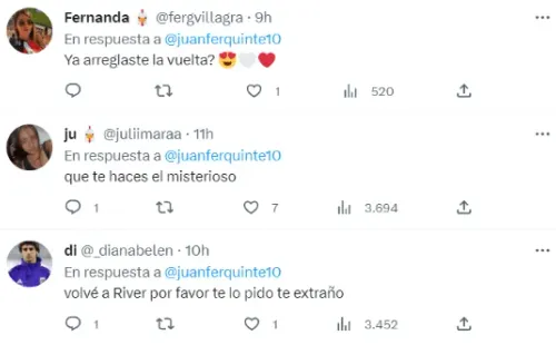 Resulta que Juanfer publicó un simple emoji y eso alcanzó para que cientos de hinchas lo tomaran como un mensaje sobre una posible vuelta. “Volvé por favor”, “hazlo” y“te extraño” fueron las palabras que más se repitieron en los comentarios.