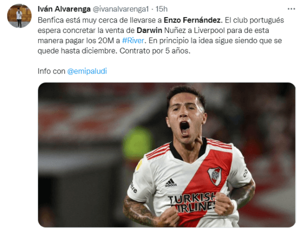 Según reportan medios ingleses, el Benfica recibió una oferta del Liverpool por el uruguayo Darwin Núñez que ronda los 80 millones de euros. En caso de concretarse la venta, desde Europa tendrán el dinero disponible (y de sobra) para poder hacer uso de la cláusula en el contrato de Enzo Fernández y no necesitar la aprobación de River en una negociación. Una situación alarmante para el equipo de Marcelo Gallardo.