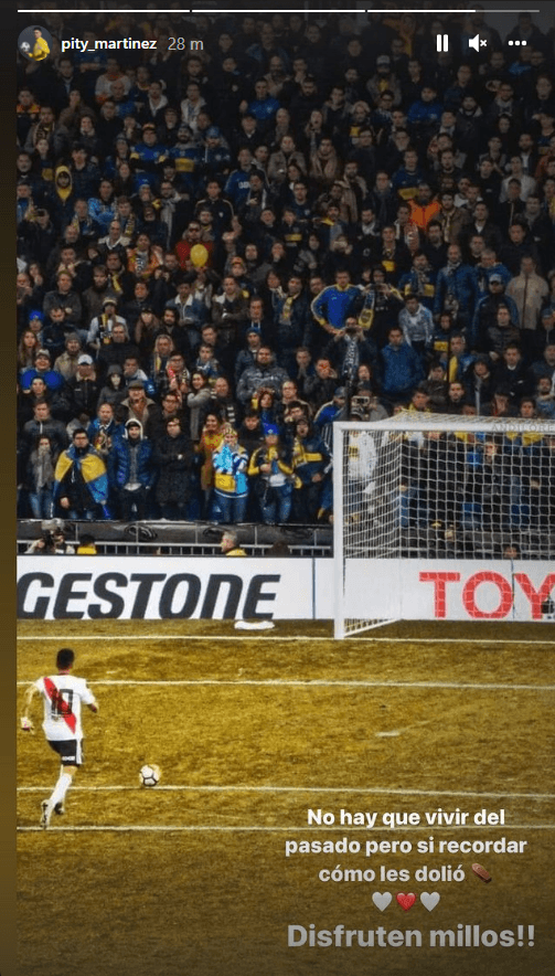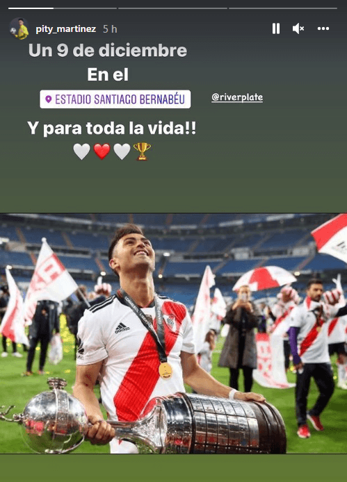Para recordar el partido histórico de 2018, uno de los protagonistas empezó a sacar recuerdos del baúl en sus redes sociales. El “Pity” Martínez, autor del tercer gol del encuentro, posteó temprano una imagen suya alzando el trofeo de la Copa Libertadores y agregó: “Un 9 de diciembre en el Santiago Bernabéu y para toda la vida”. Luego, el ex River le dedicó un mensaje a los hinchas del eterno rival por aquella final. “No hay que vivir del pasado pero sí recordar cómo les dolió”, escribió el delantero junto a un emoji de ataúd para finalizar con un “disfruten millos”.