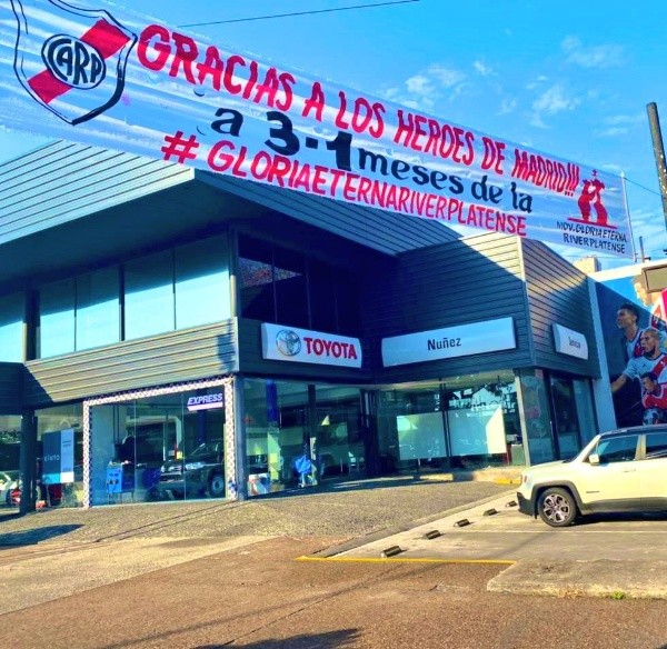 “Gracias a los héroes de Madrid!!! A 3-1 meses de la #GLORIAETERNARIVERPLATENSE”, decía la enorme bandera que fue colgada en medio de la calle por los hinchas del Millonario. La ubicación no es casualidad: en la vereda de enfrente hay un enorme mural que retrata a los jugadores que campeonaron en el Santiago Bernabéu con River, sobre la calle Figueroa Alcorta.