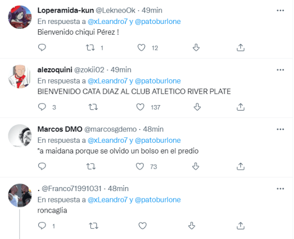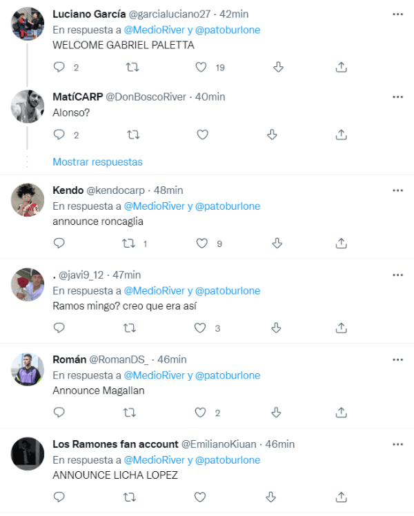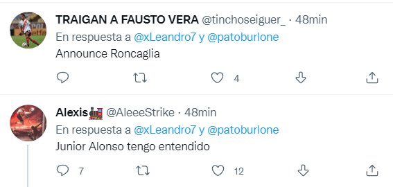A raíz de la incógnita que planteó Burlone, los hinchas comenzaron con la danza de nombres: entre ellos estuvieron los de Junior Alonso, Facundo Roncaglia, Lisandro Magallán, entre otros. Sin embargo, hasta ahora no se develó la identidad del defensor que habría sido contactado por el Millonario para sumarlo al plantel de Gallardo. ¿Se asoma una novela superclásica?