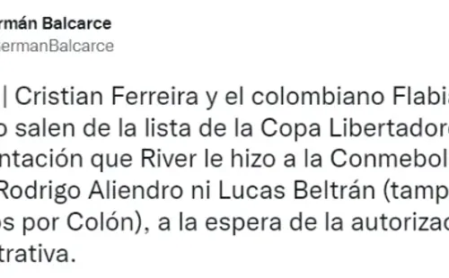 Por decisión de Gallardo, los dos “borrados” de la lista riverplatense para la Copa serán Cristian Ferreira y Flabian Londoño Bedoya. En sus lugares ingresarían Rodrigo Aliendro y Lucas Beltrán, los dos únicos refuerzos que tendría el Millonario para afrontar los octavos de final y, de superar a Vélez, también en cuartos. Cualquier otra inscripción se deberá hacer a partir de semifinales, según indica el reglamento de CONMEBOL.