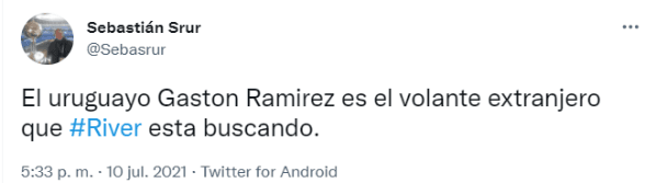 Antes de que cierre el mercado de pases, en Núñez quieren cerrar a un volante de jerarquía para aportarle creatividad al equipo. Según informó el periodista de TNT Sports, Sebastián Srur, el apuntado por River es Gastón Ramírez, quien lleva más de una década jugando tanto en Inglaterra como en Italia. El uruguayo quedó libre hace unos días y el Millonario ya se habría contactado con él.