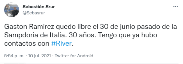 El mediocampista de 30 años llega de jugar en la Sampdoria y finalizó su vínculo el 30 de junio, por lo que es jugador libre para negociar con el pase en su poder. Como indicó el periodista de Radio Continental, desde River parece que ya hubo acercamiento y Ramírez deberá responder en los próximos días.