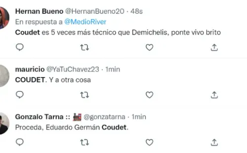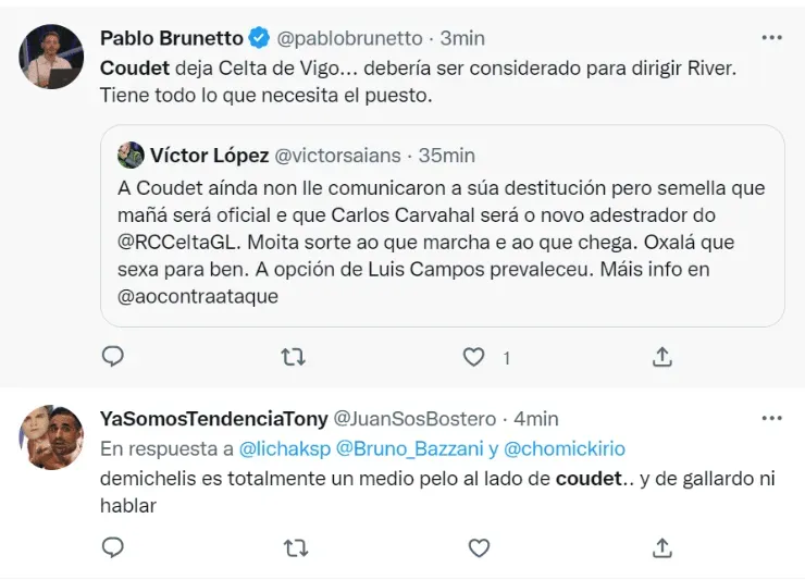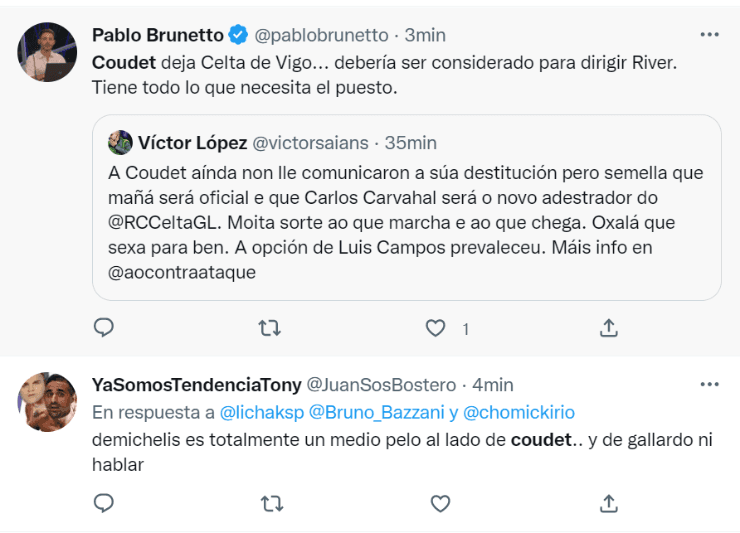 En cada ocasión que surgían los rumores de una posible salida de Gallardo, en las redes sociales, los simpatizantes de Riversolicitaban que la dirigencia comandada por RodolfoD’Onofrio, en su momento, y Jorge Brito, en la actualidad, fuera detrás de los pasos de Eduardo Coudet, quien acaba de renunciar a su cargo en Celta de Vigo, que se encuentra en la decimosexta colocación de la tabla de posiciones de LaLiga.