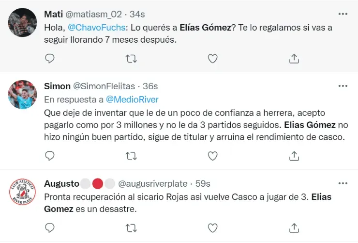 Mediante la red social del pajarito, los fanáticos del Millonario dispararon con munición pesada contra el lateral izquierdo, quien no tuvo una buena actuación frente a Independiente: “Es increíble como Elías Gómez hace todo mal. Todo”, escribió el usuario de Twitter, @LBDT14_cariver. Sin embargo, no fue el único que se mostró disconforme con el rendimiento del ex Argentinos Juniors.