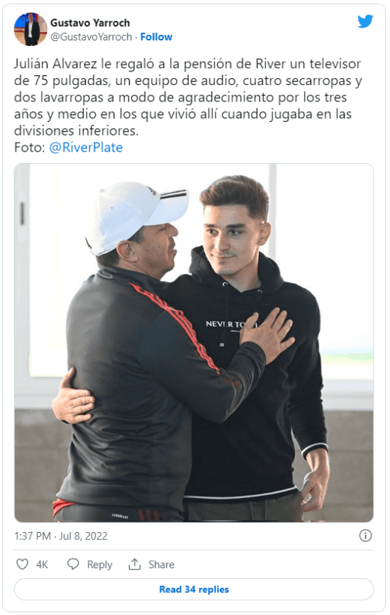 Según reveló Gustavo Yarroch, Julián le dejó a la pensión un televisor de 75 pulgadas, un equipo de audio, dos lavarropas y cuatro secarropas para agradecer todo lo que le dieron desde su llegada. Cabe recordar que el 9 estuvo más de tres años viviendo allí en su etapa de inferiores.