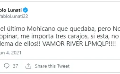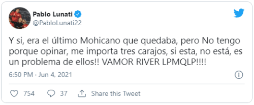 “Y si, era el último Mohicano que quedaba, pero no tengo por qué opinar, me importa tres carajos. Si está, no está, es un problema de ellos!! VAMOR RIVER LPMQLP!!!!”, manifestó en exárbitro internacional y reconocido fanático de la Banda.