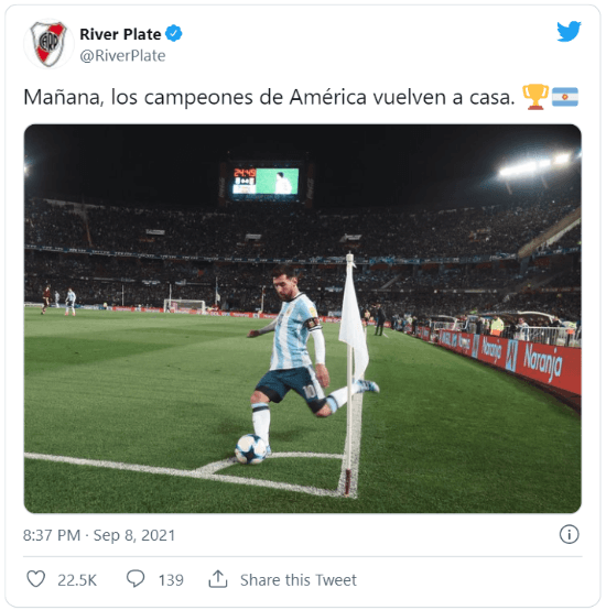 Palpitando este compromiso, la cuenta oficial de Twitter del Millonario se despachó con un mensaje dirigido a la Argentina. “Mañana, los campeones de América vuelven a casa”, escribió el club de Núñez con una foto de Messi y el último duelo que disputó ahí.