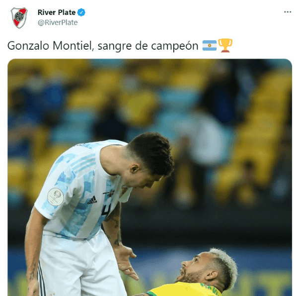 “Gonzalo Montiel, sangre de campeón”,tiró la cuenta oficial del club con la foto en la que se ve a su jugador peléandose con la estrella del Paris Saint Germain. Orgullo total.