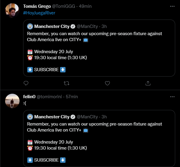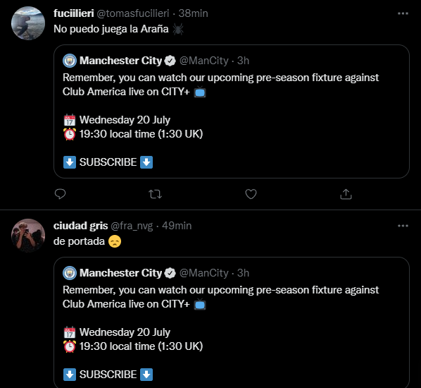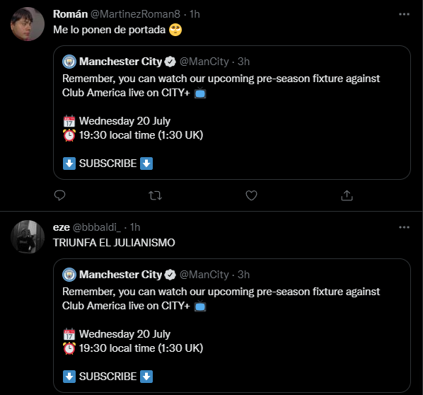 Sin embargo, desde el club inglés pretenderían que el delantero argentino juegue ante América este amistoso próximo, o al menos desde las redes sociales marcaron eso, ya que para promocionar el encuentro ante la escuadra mexicana, Álvarez apareció como portada publicitaria de la cuenta oficial del Manchester City.