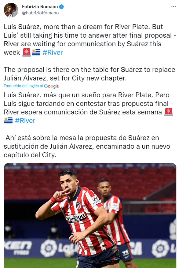Además, el italiano también dejó en claro el plan que tiene el Millonario con la posible contratación del uruguayo. “Ahí está sobre la mesa la propuesta de Suárez para ser el reemplazante de Julián Álvarez, quien está listo para un nuevo capítulo con el Manchester City”, publicó Romano. La postura que predomina es la de la cautela, esperando la respuesta oficial de Luis Suárez.