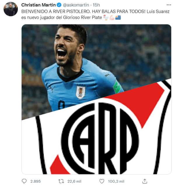 Además del posteo del periodista Bruno Vain, asegurando que “mañana lo anuncian” al Pistolero como jugador de La Banda, Christian Martin generó un “boom” luego de darle la bienvenida a Suárez con un mensaje que rápidamente se viralizó en Twitter. Dicha publicación alcanzó los 100 mil likes. ¡Increíble!