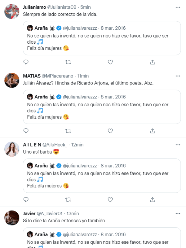 En un día tan particular como este, los hinchas trajeron al presente dicho tuit y la cantidad de citados aumentó considerablemente, con comentarios a favor de Álvarez y el uso de la canción “Mujeres”, de Ricardo Arjona.