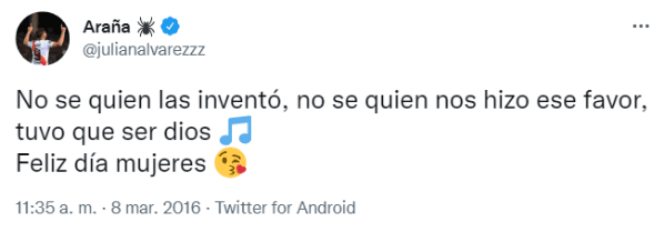 Como cada año, este martes 8 de marzo se conmemora el Día Internacional de la Mujer y, a pesar de no haberse expresado al respecto, los usuarios de la red social del pajarito azul recordaron una antigua publicación de Julián Álvarez. “No se quien las inventó, no se quien nos hizo ese favor, tuvo que ser Dios. Feliz día mujeres”, escribió la estrella de River hace 6 años.