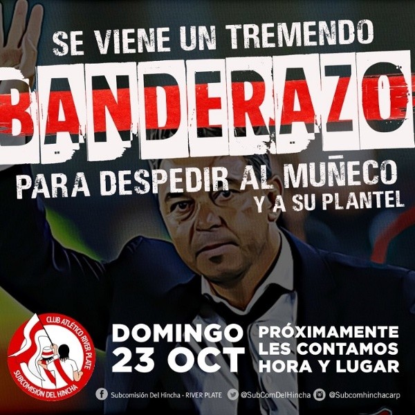 Según se pudo conocer mediante las redes sociales, la Subcomisión del Hincha de River está organizando un banderazo que podría continuar con una caravana para acompañar al entrenador y al plantel en la última presentación que tendrá en una Liga Profesional para el olvido.