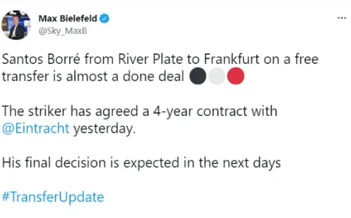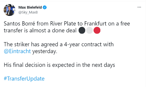 Fue el periodista alemán Max Bielefeld quien afirmó en su cuenta de Twitter que el acuerdo entre el delantero y el Frankfurt de la Bundesliga ya es casi un hecho. El contrato que firmaríasería por cuatro años, llegando gratis desde el conjunto de Núñez. La decisión debería ser tomada de manera oficial en estos días.