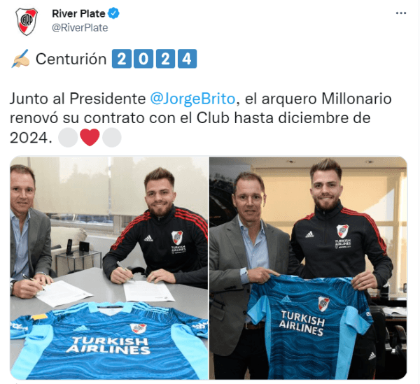 Su buen pasar como primer recambio del “Pulpo” ante las salidas de Germán Lux y Enrique Bologna fue premiado con la renovación de su contrato, anunciado este martes por la tarde en las vías oficiales de River. “Junto al Presidente Jorge Brito,el arquero Millonario renovó su contrato con el Club hasta diciembre de 2024″, informó la institución de Núñez a través de Twitter.
