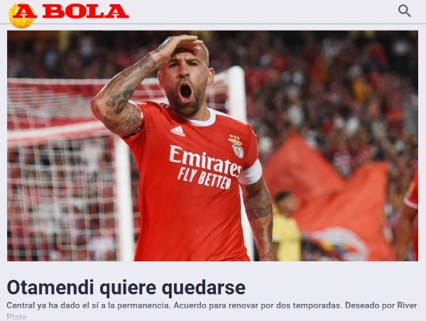 Según el portal portugués, el surgido en Vélez está decidido a extender su estadía en el Viejo Continente, compitiendo al máximo nivel, y Otamendi habría decidido firmar la extensión de vínculo por dos temporadas más. Una noticia que trunca todas las aspiraciones de River, aunque lo esperarán hasta último momento. ¿Se dará en alguna oportunidad?