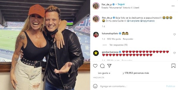 Florencia posó para una foto junto a Darío Lopilato, otro de los protagonistas de la ya legendaria sitcom “Casados con Hijos”, y la publicó con un mensaje para “Pepe Argento”: “¡¡¡Esta foto se la dedicamos a papuchoooo!!! ¡¡¡En tu cara, Guille!!!”.