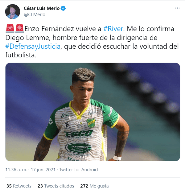 “Enzo Fernández después del entrenamiento de hoy fue liberado en Defensa y Justicia, se despidió de sus compañeros y mañana se presentará para entrenarse en River. Vuelve como lo pidió Gallardo, los estudios médicos que se hizo en Defensa son válidos, tendrá otro aleatorios en River”, comentó Juan Cortese en TyC Sports.