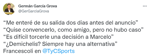 Sobre este tema fue consultado Enzo Francescoli, ni más ni menos que el encargado de decidir quién será el nuevo DT de River. En una entrevista temprana con TyC Sports, al secretario técnico le preguntaron por Martín Demichelis, máximo candidato a reemplazar al Muñeco, pero evitó dar grandes detalles sobre el nuevo entrenador. “Siempre hay una alternativa”, expresó Enzo ante la pregunta del panel.