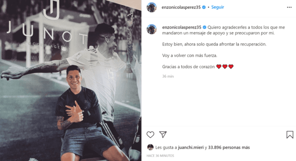 Y fue justamente el propio mediocampista mendocino quien apareció en sus redes sociales luego de que se confirmara que no deberá ser operado:“Quiero agradecerles a todos los que me mandaron un mensaje de apoyo y se preocuparon por mi. Estoy bien, ahora solo queda afrontar la recuperación. Voy a volver con más fuerza”, escribió en su cuenta de Instagram.