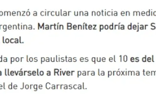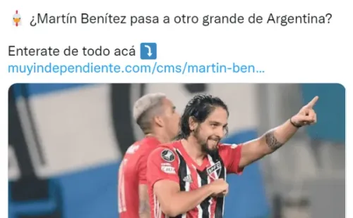 El segundo nombre que llegó a la órbita rojiblanca es el de Martín Benítez, cuyo contrato se vence en apenas 2 meses y aún no hay novedades acerca de su renovación. Medios partidarios de Independiente, como MuyCAI, reportaron que el jugador del San Pablo “es del interés de Marcelo Gallardo”,alegando la intermitencia de Jorge Carrascal en el primer equipo.