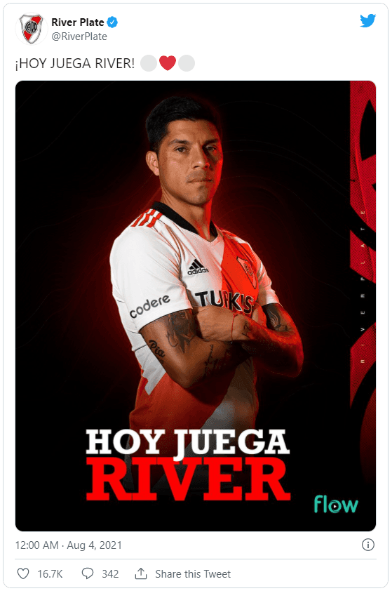 Tal como sucede siempre a las 0:00 de cada partido, la cuenta oficial del club publicó el icónico “hoy juega River” para que exploten los hinchas. Esta vez, la gran figura que aparece en la gráfica es Enzo Pérez, uno de los más queridos del ciclo Gallardo y gran pilar en la mitad de la cancha.