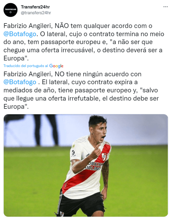 Según cuenta el portalTorcedores.com,“el Botafogo dio otro paso importante para fichar a Fabrizio Angileri y el lateral izquierdo avisó a la directiva alvinegra que está dispuesto a escuchar una propuesta en los próximos días”. Además, el sitio web afirmó que el de Junín ya tiene un pre-contrato sobre la mesa, a espera de su decisión.
