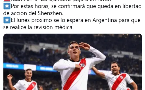Todo parecía encaminado, el jugador coqueteaba con su vuelta en las redes y de repente la negociación ingresó en una meseta. Pero después de casi un mes, la novela llegó a su fin:Juan Fernando Quintero jugará el próximo año en River.